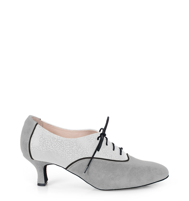 PILAR  Szaro białe buty treningowe na 5,5 cm obcasie (wysokość obcasa jest mierzona dla rozmiaru 37) z czarną lamówką. Buty dedykowane do ćwiczeń tanga i tańców towarzyskich. Podeszwa skórzana welurowa, dzięki czemu jest elastyczna i miękka. PILAR to wygodne buty sznurowane do ćwiczeń oraz do tańca klasycznego. Buty dobrze wyglądają do spódnico-spodni. Ze względu na welurową podeszwę, buty te nie nadają się do chodzenia po chodniku i są przeznaczone wyłącznie na parkiet.