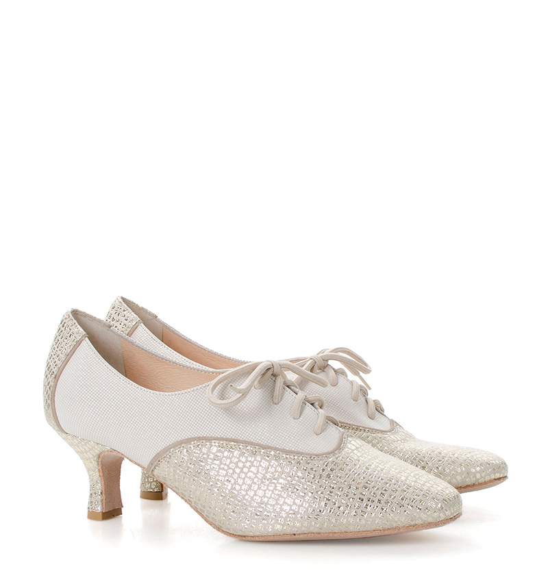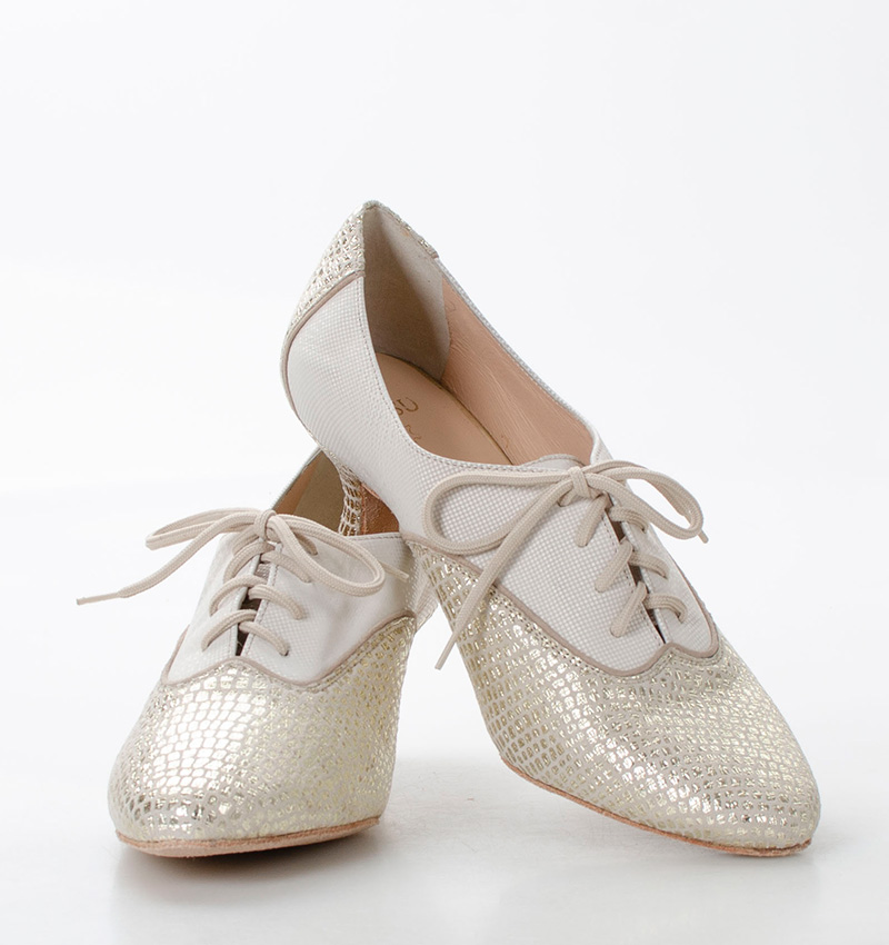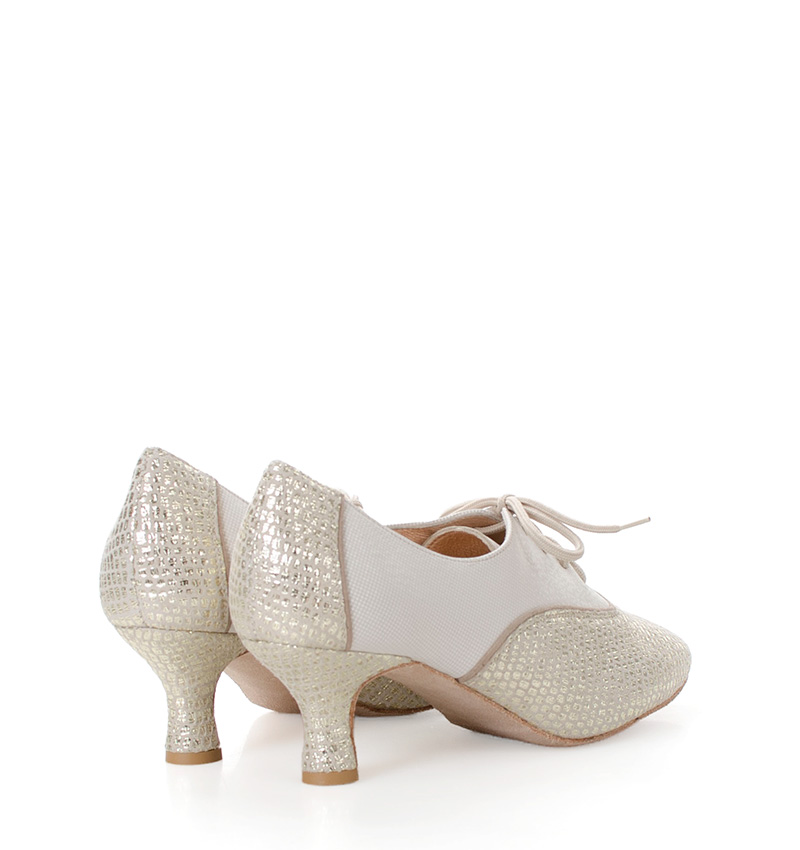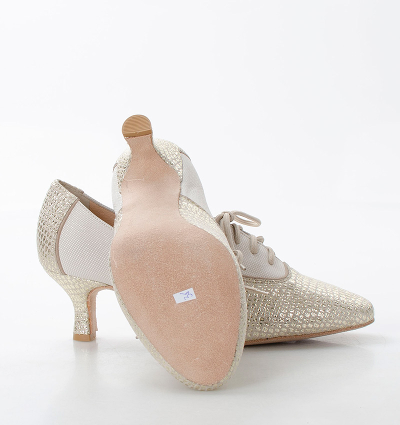 PILAR – Złoto beżowe buty treningowe na 5,5 cm obcasie (wysokość obcasa jest mierzona dla rozmiaru 37). Buty dedykowane do ćwiczeń tanga i tańców towarzyskich. Podeszwa skórzana welurowa, dzięki czemu jest elastyczna i miękka. PILAR to wygodne buty sznurowane do ćwiczeń oraz do tańca klasycznego. Buty dobrze wyglądają do spódnico-spodni. Ze względu na welurową podeszwę, buty te nie nadają się do chodzenia po chodniku i są przeznaczone wyłącznie na parkiet.