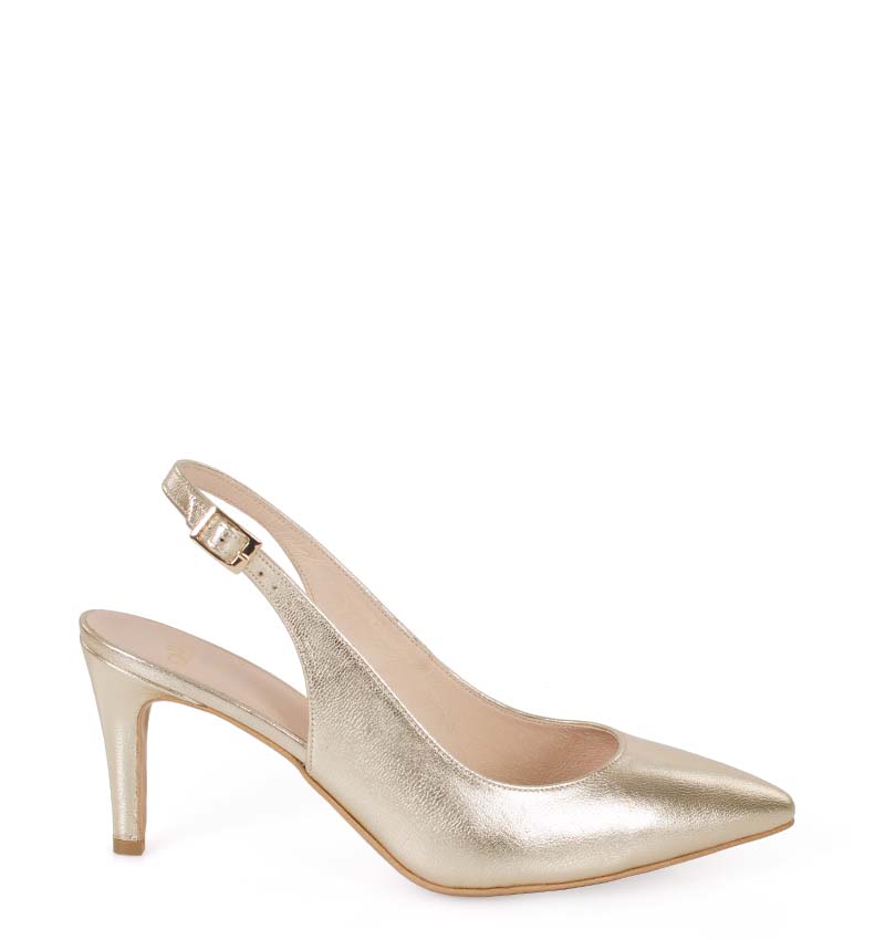 POLA – Złote platynowe szpilki z odkrytą piętą, na 8 cm obcasie (wysokość obcasa jest mierzona w rozmiarze 37). Czubek w szpic, zapinane na pasek z klamerką. Buty wykonane z naturalnej skóry licowej układającej się do stopy. Średnia wysokość obcasa i licowa skóra, sprawia, że są to wygodne szpilki z odkrytą piętą. Tęgość butów to F 1/2. Złote szpilki pięknie prezentują się do sukni ślubnych i kreacji wizytowych.