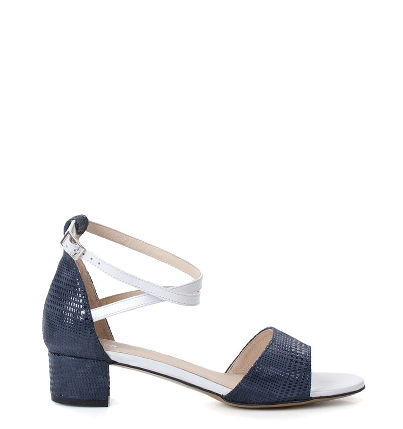 ROBIN –  Biało granatowe na niskim obcasie z licowej skóry. Obcas 3,5 cm (wysokość obcasa jest mierzona w rozmiarze 37). Wygodne sandałki z zakryta piętą i paskiem na krzyż wokół kostki. Buty wykonane z naturalnej skóry układającej się do stopy. Tęgość butów to F 1/2. Granatowo białe sandałki obcasie są bardzo wygodne i zapewniają wysoki komfort w upalne dni.