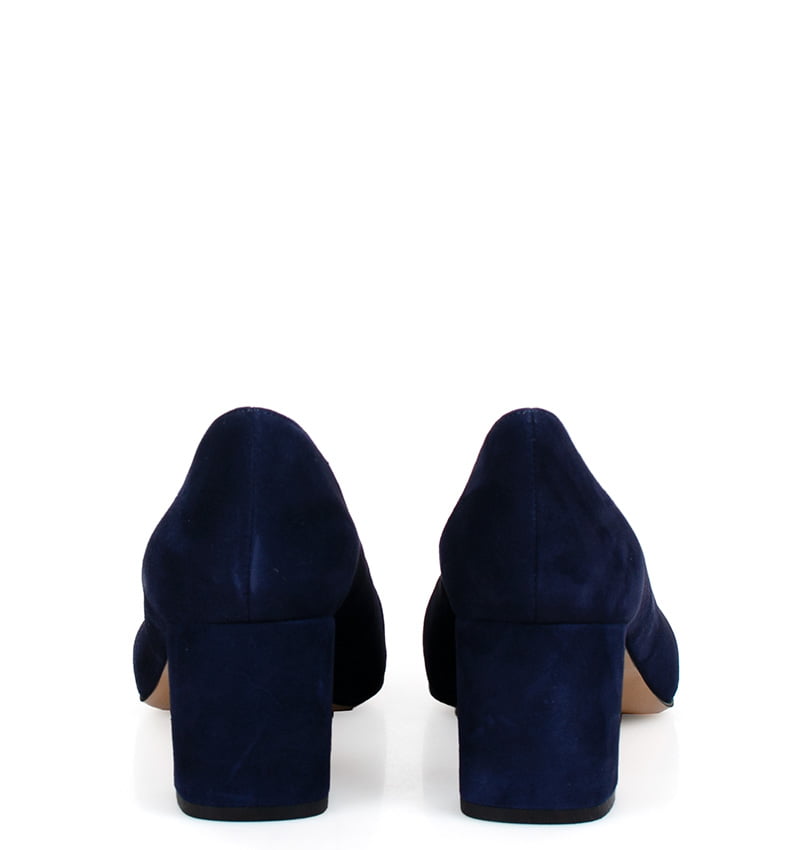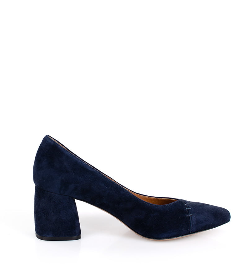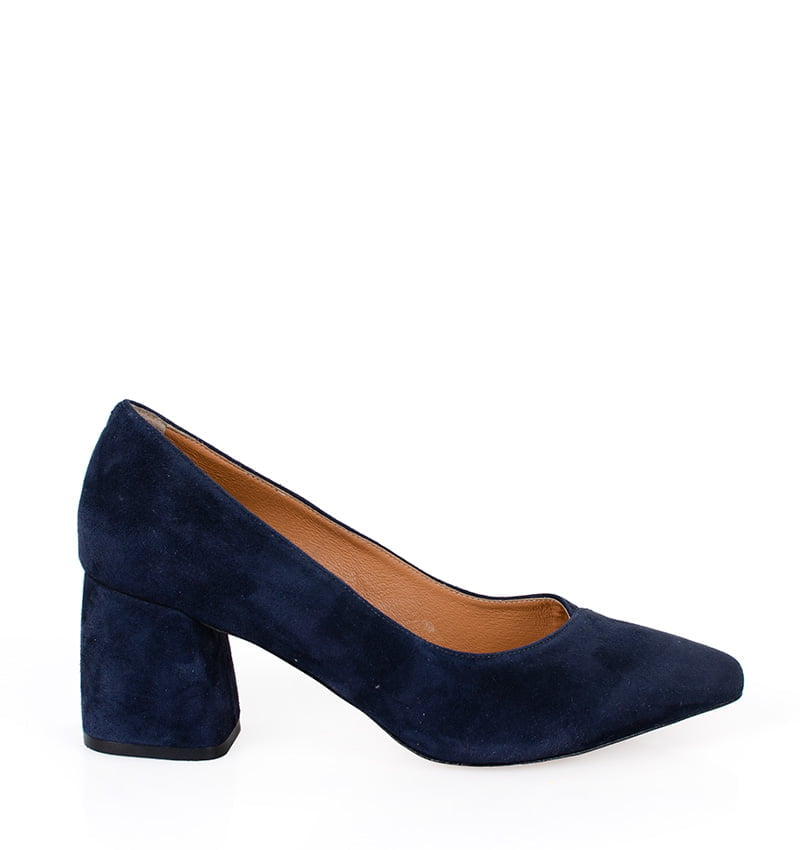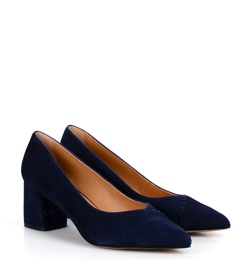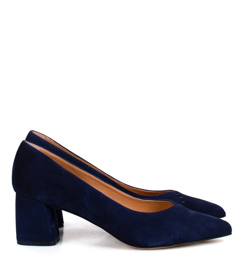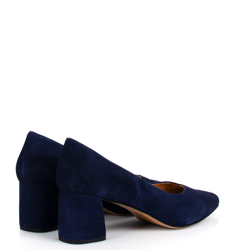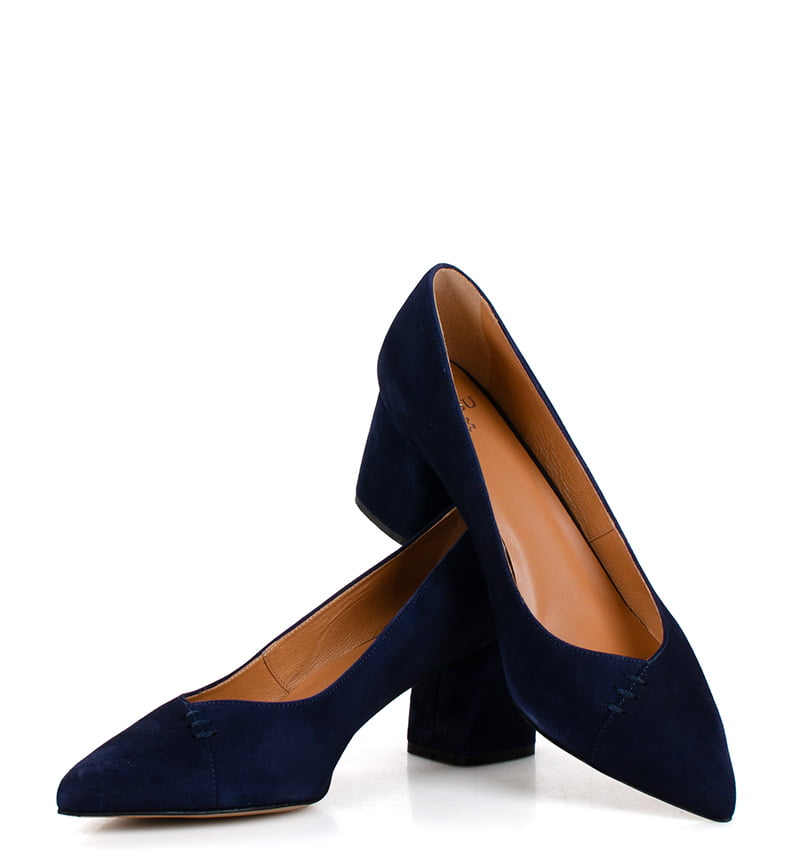 RUTH – Granatowe czółenka na 6,5 cm słupku (wysokość obcasa jest mierzona w rozmiarze 37). Cholewka z ozdobną zakładką, czubek w szpic. Buty wykonane z naturalnej skóry zamszowej. Średnia wysokość szerokiego obcasa sprawia, że są to bardzo wygodne szpilki do codziennego użytku. Tęgość butów: F 1/2. Wnętrze butów i wkładka wykonane są ze skóry naturalnej.