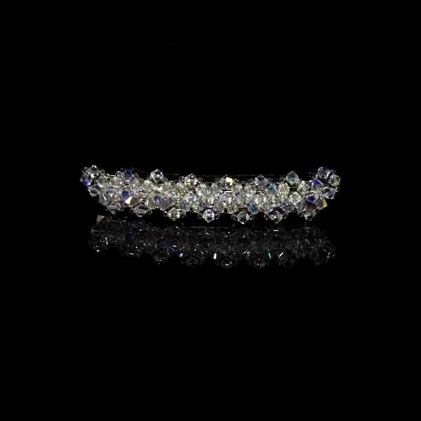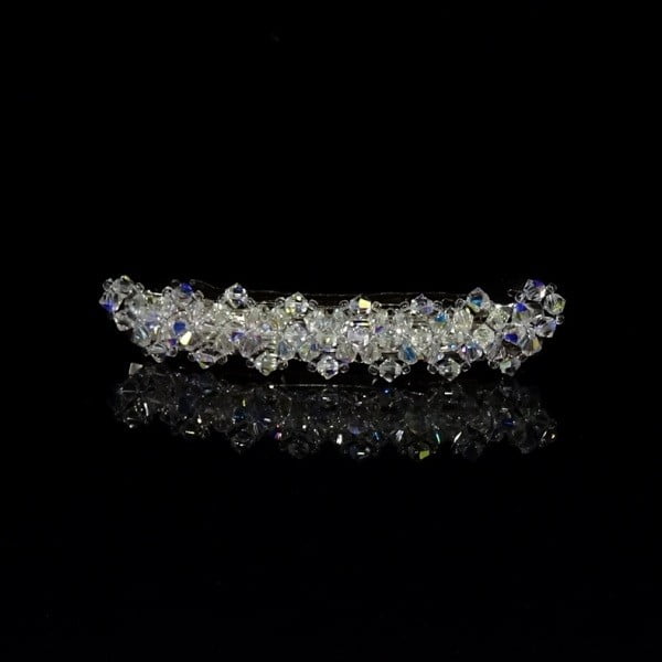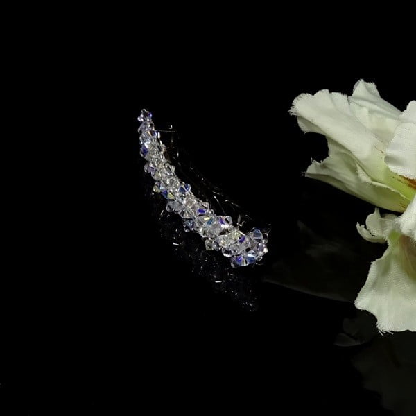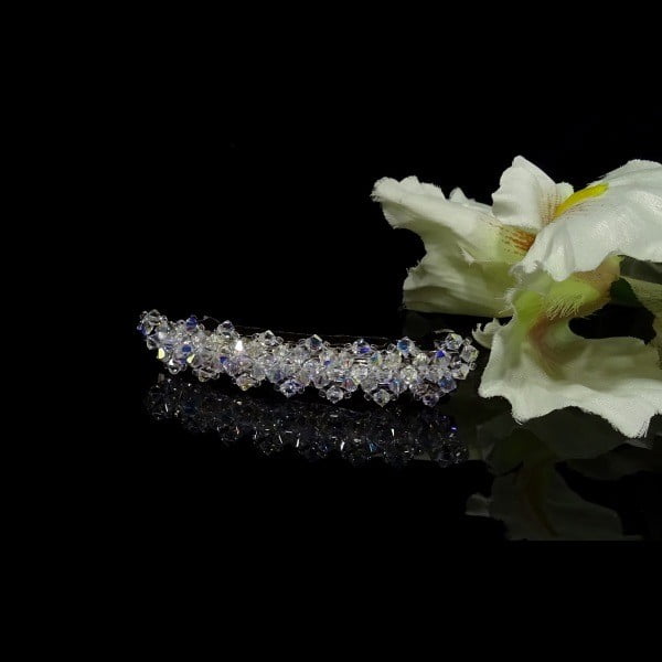 Spinka do włosów – szeroka z pięknym motywem wykonana z kryształów Precioso 4 mm w kolorze Crystal AB i japońskich koralikow toho o11. Bardzo ładnie wygląda jako dodatek nad welonem lub pod kok.