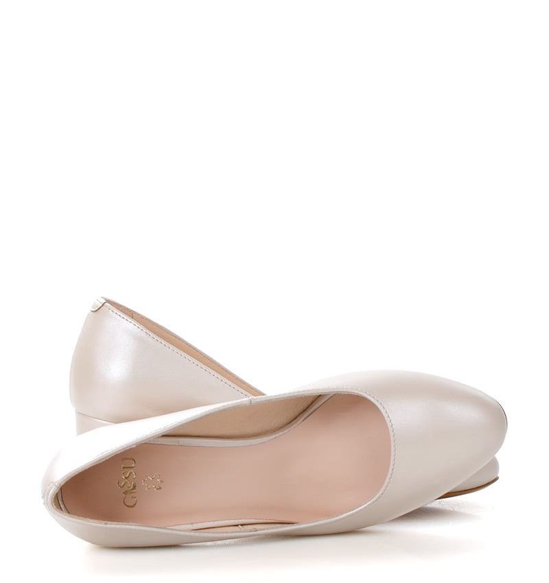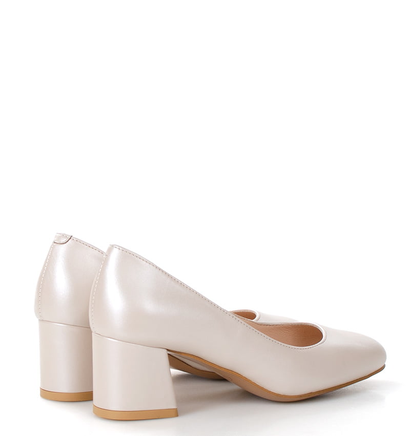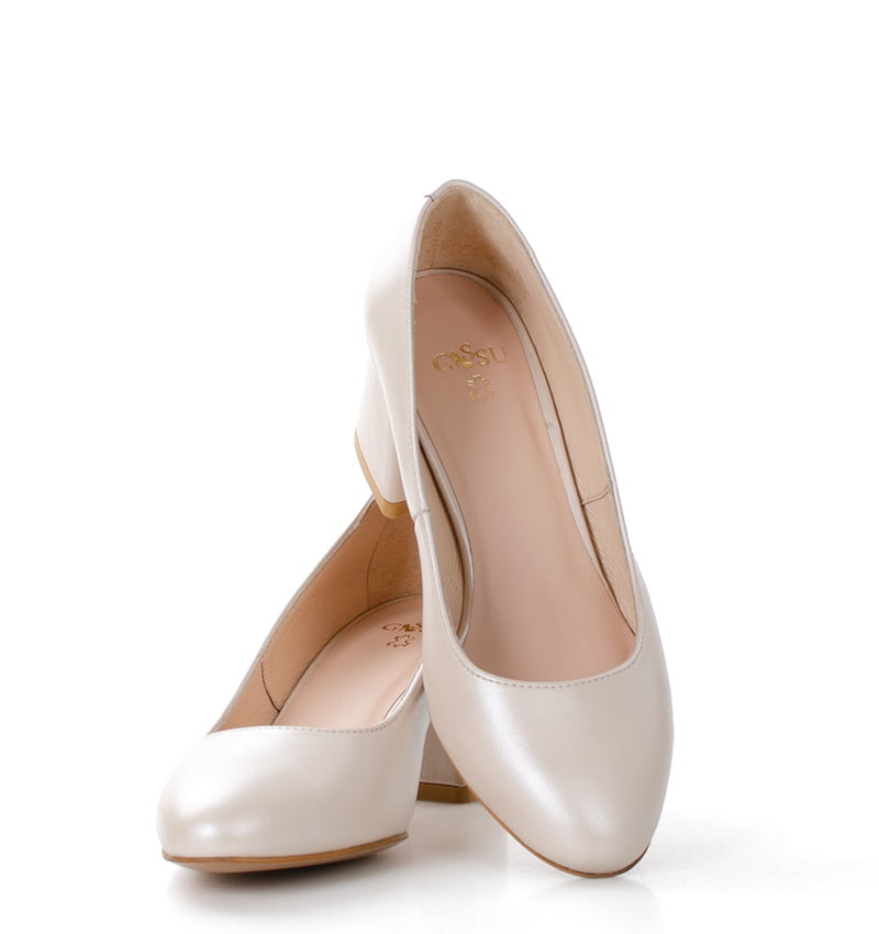SUSANNA – Beżowe czółenka na 5,5 cm słupku (wysokość obcasa jest mierzona w rozmiarze 37). Buty wykonane z naturalnej skóry z perłowym połyskiem. Średnia wysokość szerokiego obcasa sprawia, że są to bardzo wygodne szpilki do codziennego użytku. Tęgość butów: F 1/2. Wnętrze butów i wkładka wykonane są ze skóry naturalnej.