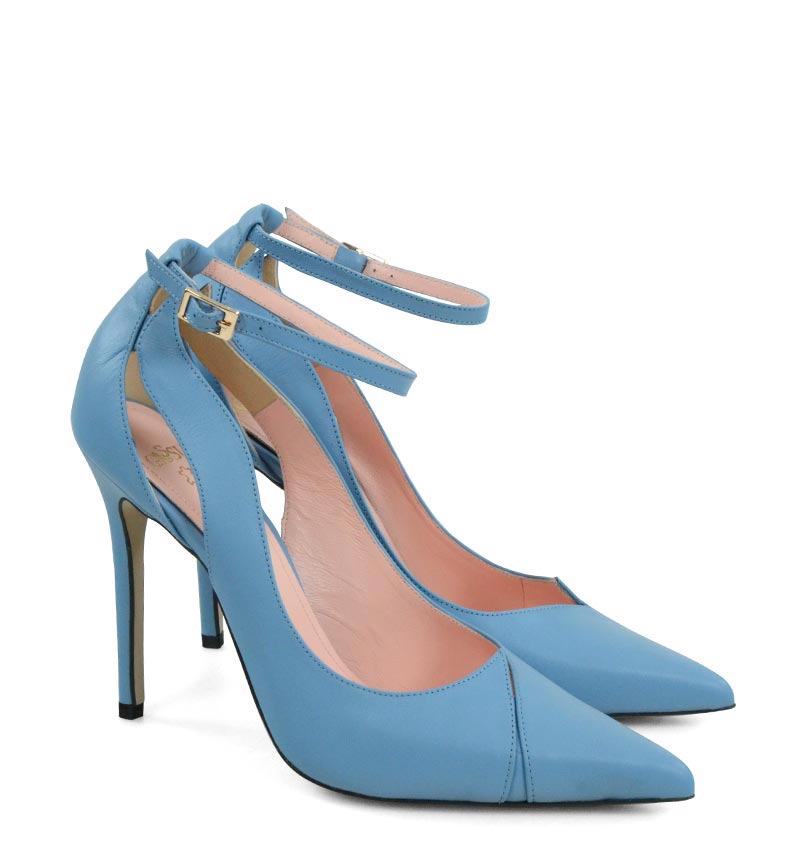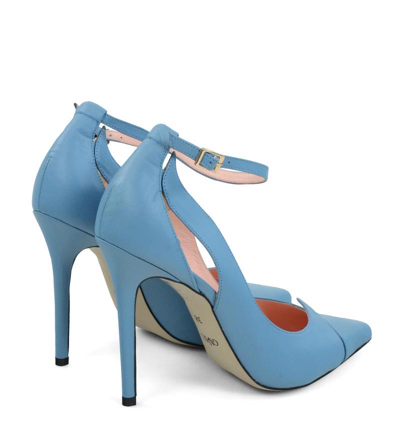 TESS – Szpilki niebieskie z licowej skóry z paskiem i wycięciami