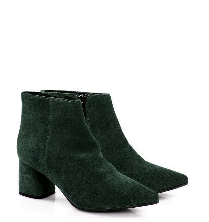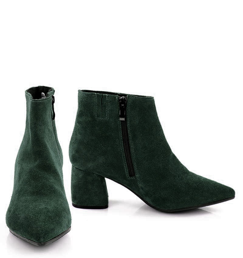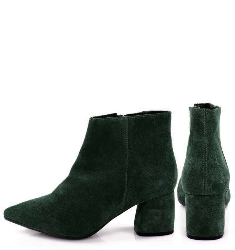 VERA – Ciemno zielone botki na 6,5 cm słupku (wysokość obcasa jest mierzona w rozmiarze 37). Czubek w szpic, zapinane na zamek . Buty wykonane z naturalnej skóry welurowej układającej się do stopy. Średnia wysokość obcasa sprawia, że są to wygodne botki. Tęgość butów: G. Wnętrze butów ocieplone cienkim kocem obuwniczym.