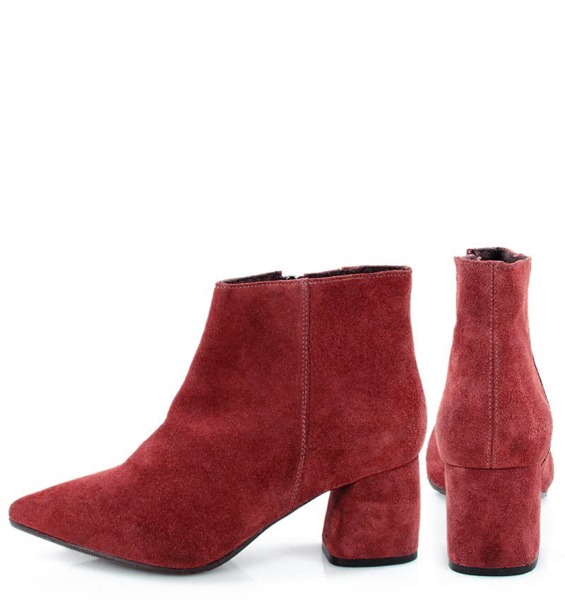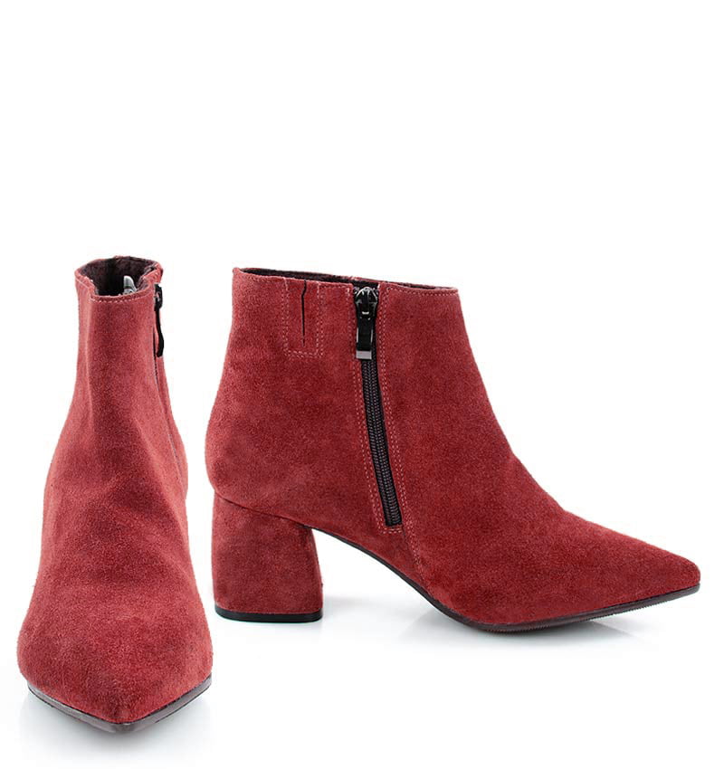 VERA – Czerwone botki na 6,5 cm słupku (wysokość obcasa jest mierzona w rozmiarze 37). Czubek w szpic, zapinane na zamek . Buty wykonane z naturalnej skóry welurowej układającej się do stopy. Średnia wysokość obcasa sprawia, że są to wygodne botki. Tęgość butów: G. Wnętrze butów ocieplone cienkim kocem obuwniczym.