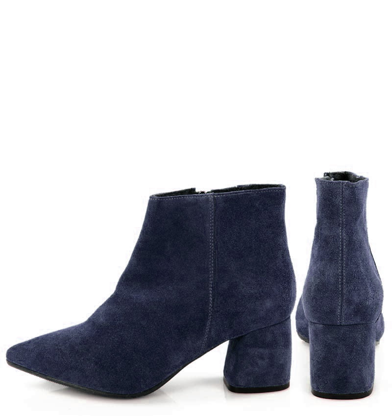 VERA –  Granatowe botki na 6,5 cm słupku (wysokość obcasa jest mierzona w rozmiarze 37). Czubek w szpic, zapinane na zamek . Buty wykonane z naturalnej skóry welurowej układającej się do stopy. Średnia wysokość obcasa sprawia, że są to wygodne botki. Tęgość butów: G. Wnętrze butów ocieplone cienkim kocem obuwniczym.