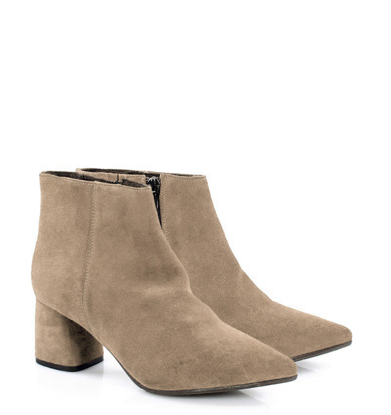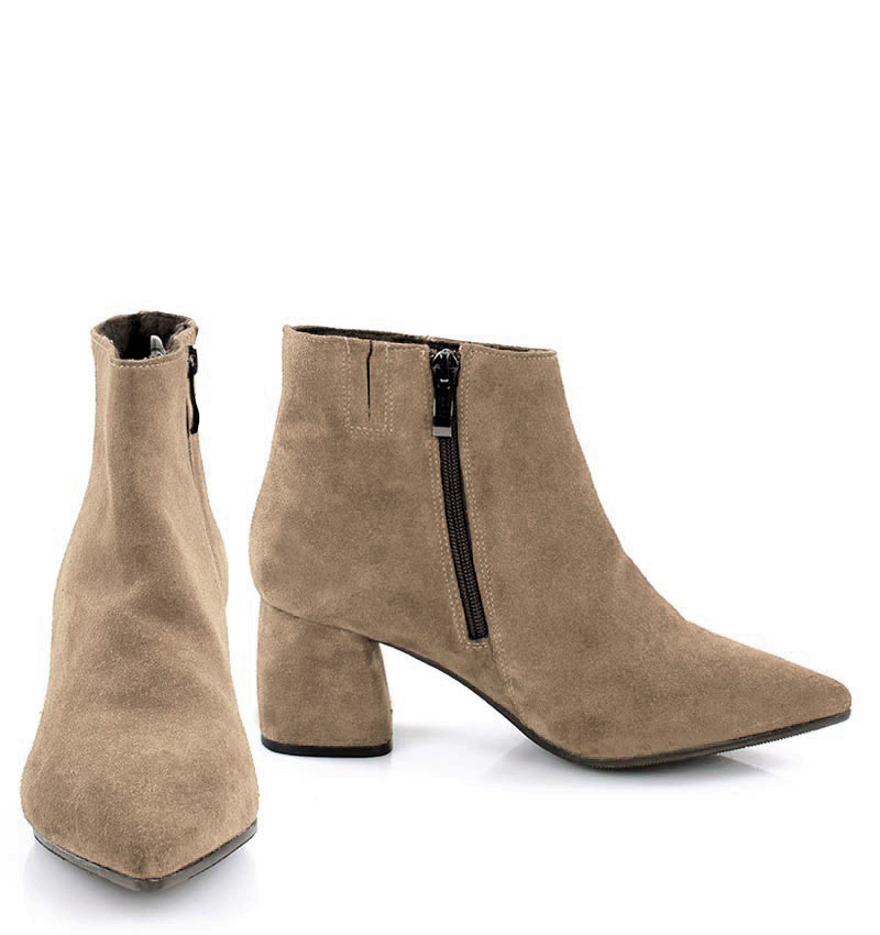 VERA – Jasno beżowe botki na 6,5 cm słupku (wysokość obcasa jest mierzona w rozmiarze 37). Czubek w szpic, zapinane na zamek . Buty wykonane z naturalnej skóry welurowej układającej się do stopy. Średnia wysokość obcasa sprawia, że są to wygodne botki. Tęgość butów: G. Wnętrze butów ocieplone cienkim kocem obuwniczym.