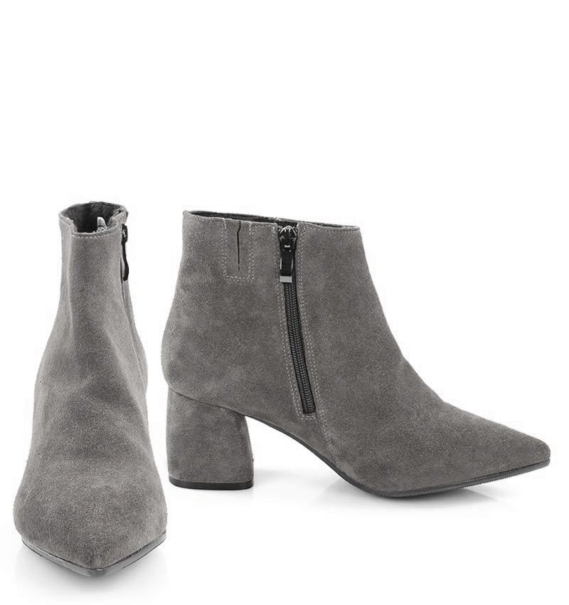 VERA – Szare botki na 6,5 cm słupku (wysokość obcasa jest mierzona w rozmiarze 37). Czubek w szpic, zapinane na zamek . Buty wykonane z naturalnej skóry welurowej układającej się do stopy. Średnia wysokość obcasa sprawia, że są to wygodne botki. Tęgość butów: G. Wnętrze butów ocieplone cienkim kocem obuwniczym.