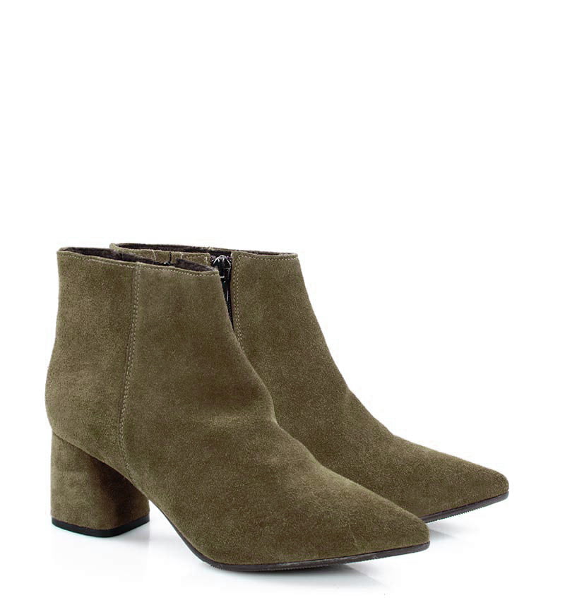 VERA –  Zielone botki na 6,5 cm słupku (wysokość obcasa jest mierzona w rozmiarze 37). Czubek w szpic, zapinane na zamek . Buty wykonane z naturalnej skóry welurowej układającej się do stopy. Średnia wysokość obcasa sprawia, że są to wygodne botki. Tęgość butów: G. Wnętrze butów ocieplone cienkim kocem obuwniczym.