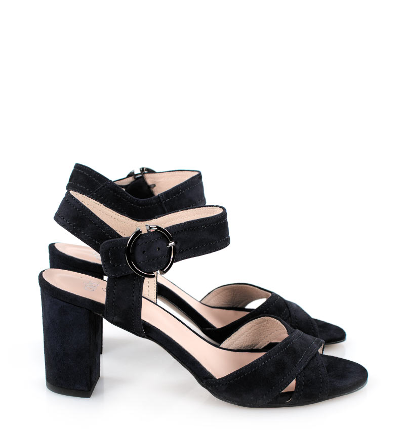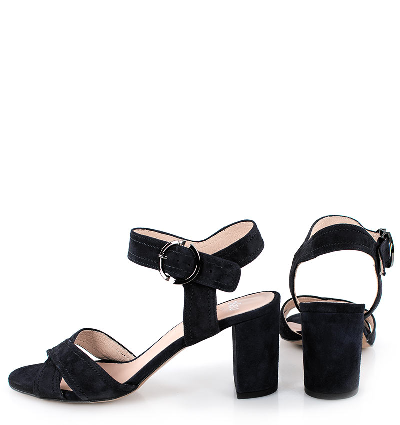 VIVIAN – Czarne sandałki na 7,5 cm słupku, wykonane z naturalnej skóry zamszowej, (wysokość obcasa jest mierzona w rozmiarze 37). Cholewka w postaci szerokich pasków dobrze trzyma stopę, dzięki czemu sandałki są wygodne. Tęgość butów to F 1/2.