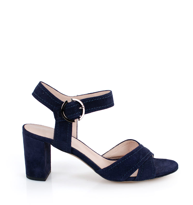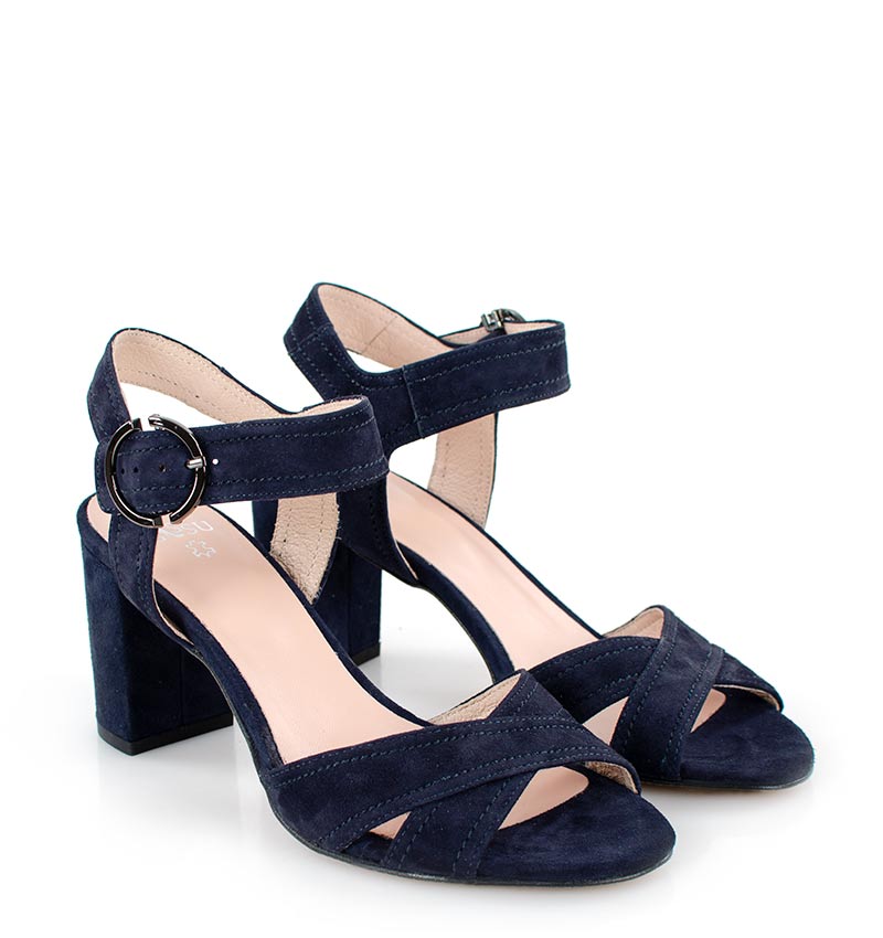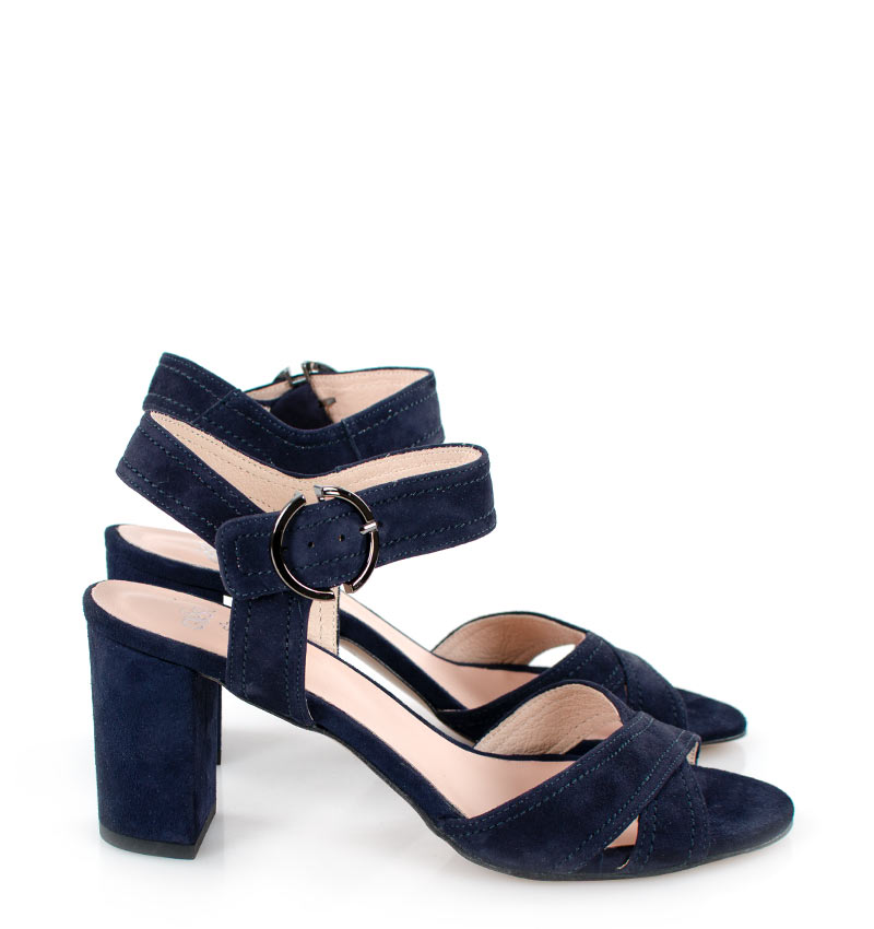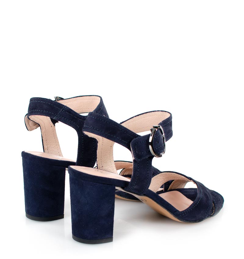VIVIAN – Granatowe sandałki na 7,5 cm słupku, wykonane z naturalnej skóry zamszowej, (wysokość obcasa jest mierzona w rozmiarze 37). Cholewka w postaci szerokich pasków dobrze trzyma stopę, dzięki czemu sandałki są wygodne. Tęgość butów to F 1/2.