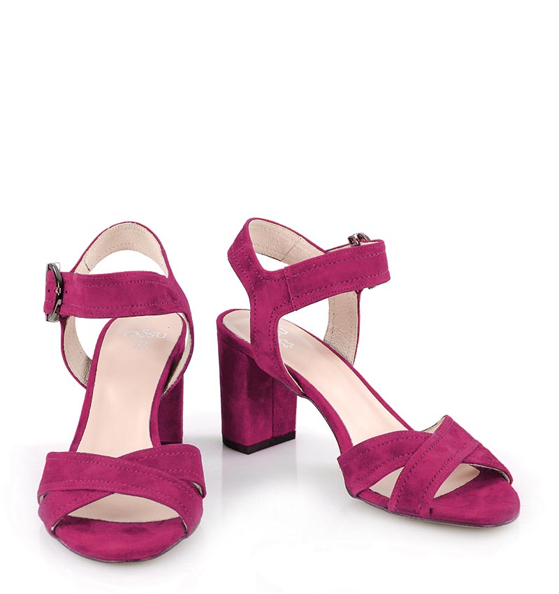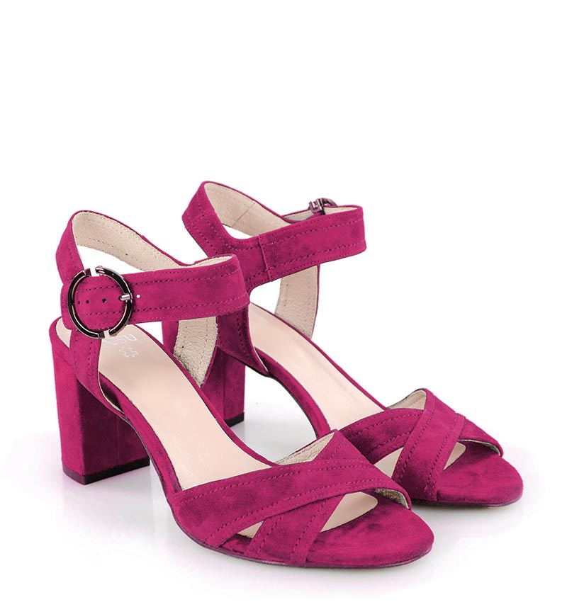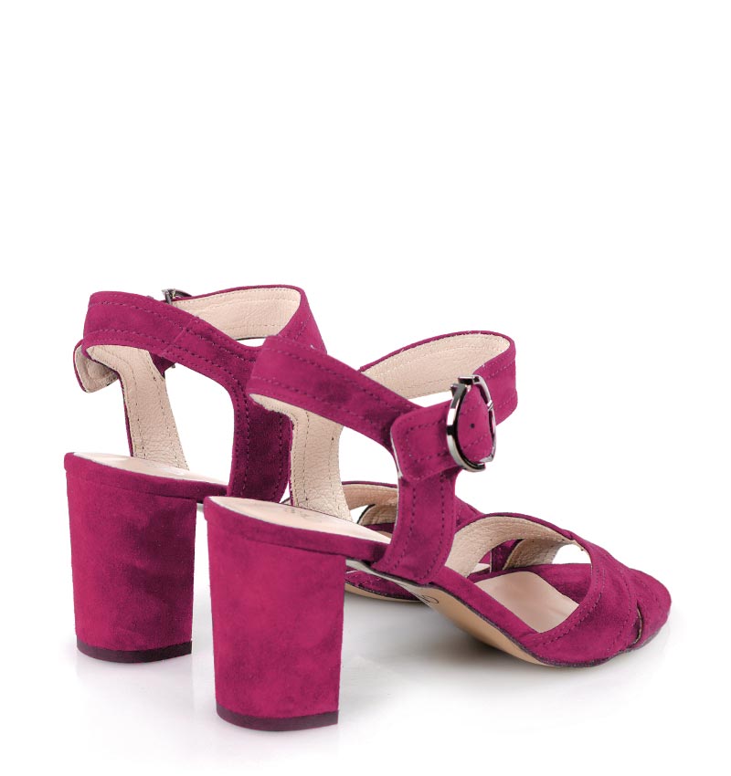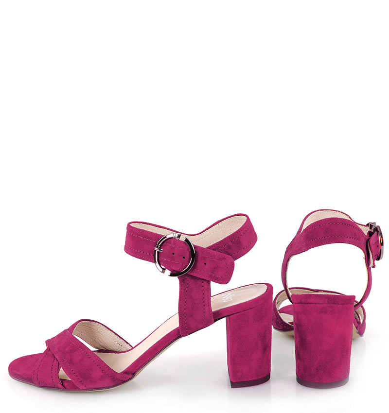 VIVIAN – Różowe sandałki na 7,5 cm słupku, wykonane z naturalnej skóry zamszowej, (wysokość obcasa jest mierzona w rozmiarze 37). Cholewka w postaci szerokich pasków dobrze trzyma stopę, dzięki czemu sandałki są wygodne. Tęgość butów to F 1/2.