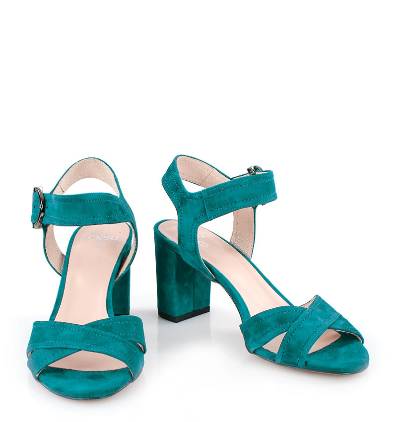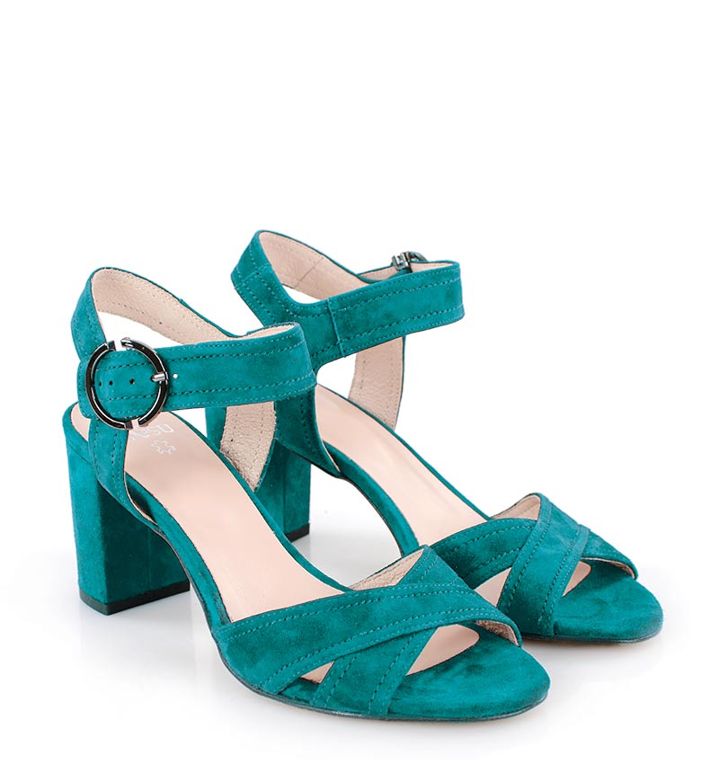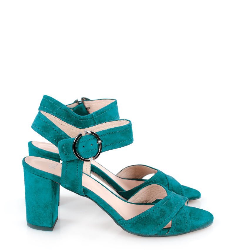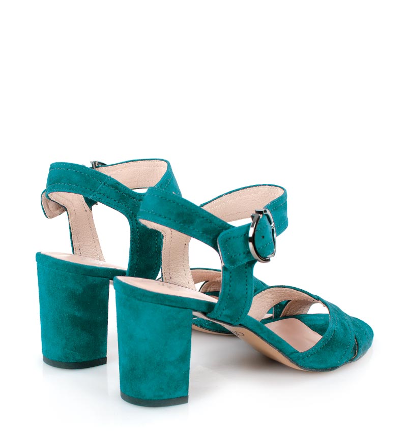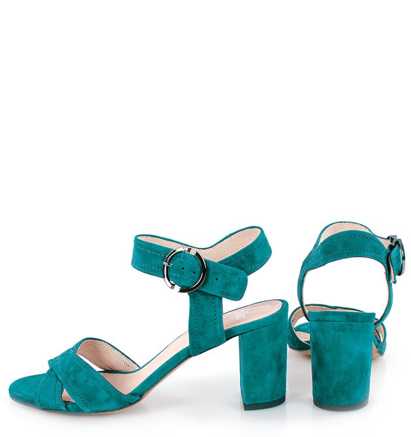 VIVIAN – Zielone sandałki na 7,5 cm słupku, wykonane z naturalnej skóry zamszowej, (wysokość obcasa jest mierzona w rozmiarze 37). Cholewka w postaci szerokich pasków dobrze trzyma stopę, dzięki czemu sandałki są wygodne. Tęgość butów to F 1/2.
