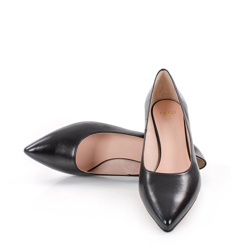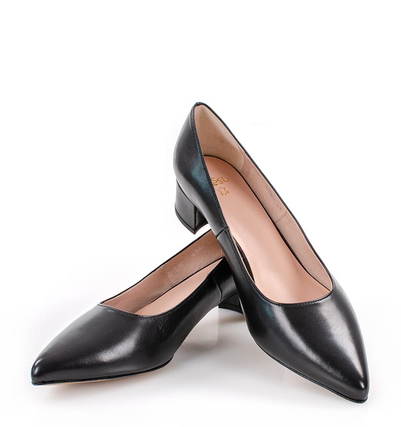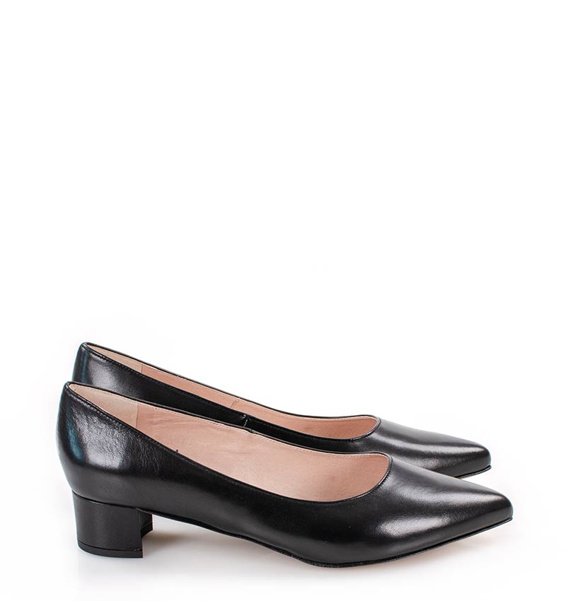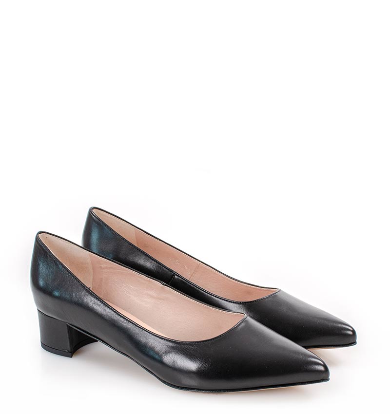 WERONICA –  Czarne niskie czółenka na 4 cm grubym obcasie (wysokość obcasa jest mierzona w rozmiarze 37). Czubek w szpic. Buty wykonane z naturalnej skóry licowej, układającej się do stopy. Niska wysokość obcasa sprawia, że są to bardzo wygodne czółenka. Tęgość butów: G. Wnętrze butów i wkładka wykonane są ze skóry naturalnej.