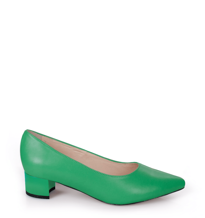WERONICA –  zielone niskie czółenka na 4 cm grubym obcasie (wysokość obcasa jest mierzona w rozmiarze 37). Czubek w szpic. Buty wykonane z naturalnej skóry licowej, układającej się do stopy. Niska wysokość obcasa sprawia, że są to bardzo wygodne czółenka. Tęgość butów: G. Wnętrze butów i wkładka wykonane są ze skóry naturalnej.
