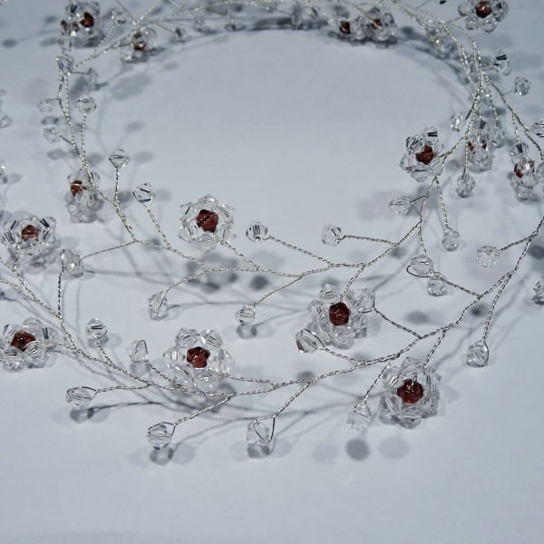 Stroik do włosów – Wianek ze szklanych kryształków na druciku w kolorze jasnego srebra. Wplecione kwiatuszki dodają osobliwego uroku. W środku każdego kwiatuszka, budgundowy kryształek. Gałązka może być upięta jako wianek lub otoczka koka. Doskonały dodatek ślubny jak i wieczorowy.